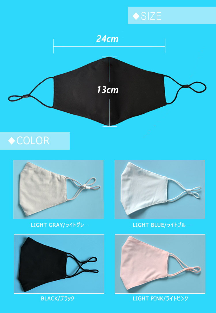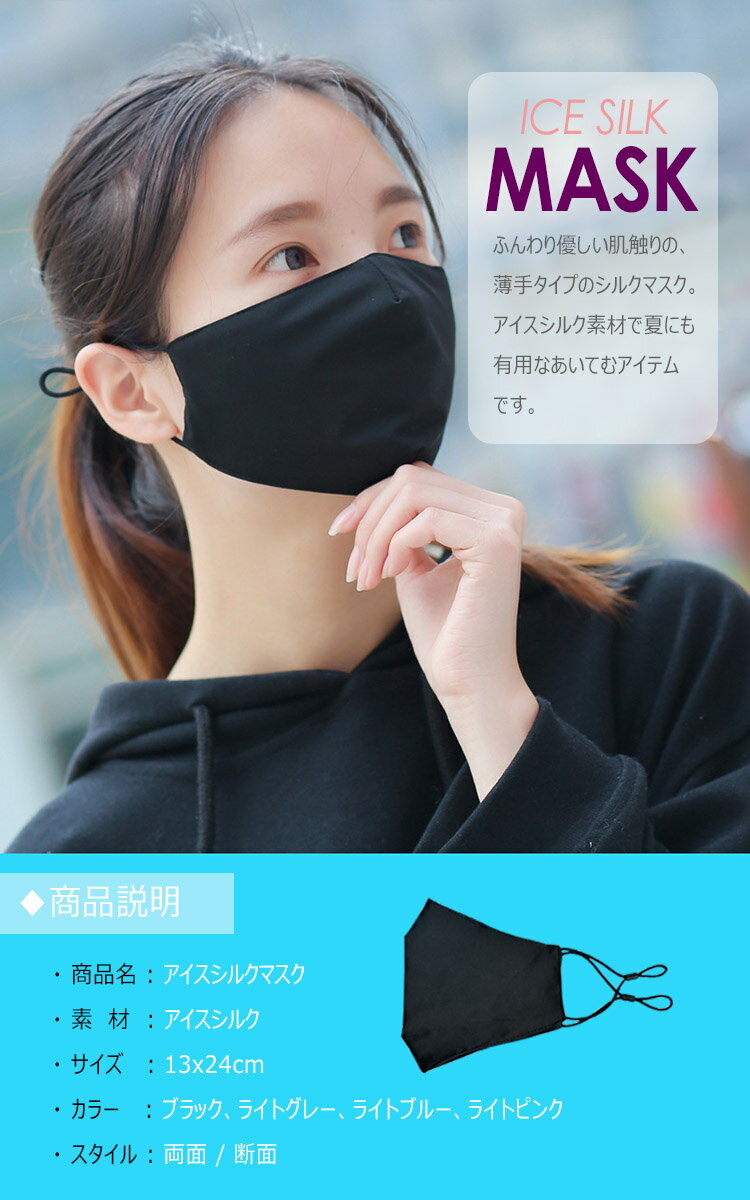 商品名 洗えるアイスシルクマスク(3Pack 1Set) 素 材 アイスシルク カラー ブラック、ライトグレー、ライトブルー、ライトピンク サイズ 13x24cm スタイル 両面 / 断面 備考 ふんわり優しい肌触りの、薄手タイプのシルクマスク。